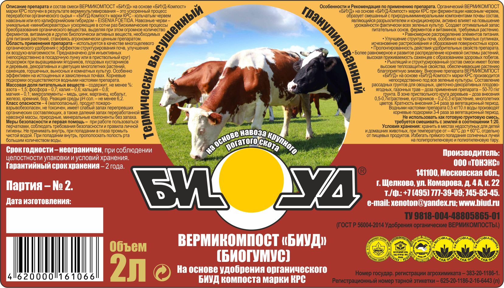 Продукт ЖОУ "БИУД" универсальный для овощей получен методом аэробной ферментации конского навоза в био-реакторах при термофильных температурах и условиях сбраживания органического субстрата.